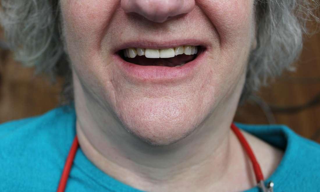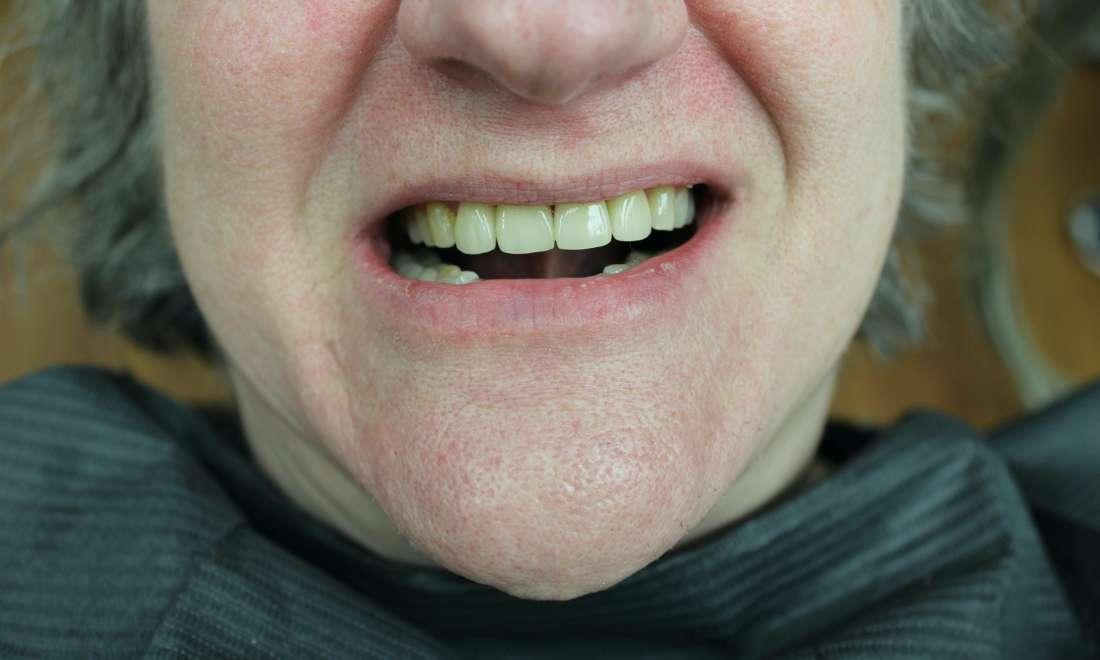 This patient received custom porcelain crowns to conceal and restore her chipped and broken teeth.